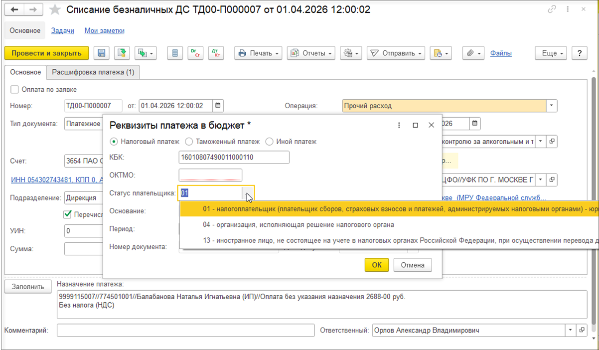 заполняются автоматически и не доступны для редактирования. КБК может заполняться по последнему аналогичному платежу;
