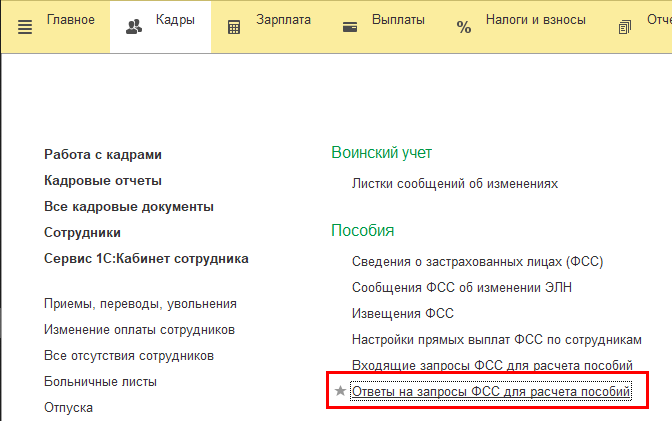 Реализована отправка сведений для расчета больничных и пособий по уходу за ребенком через СЭДО. Добавлен документ "Ответ на запрос ФСС для расчета пособия". На основании входящего запроса ФСС можно ввести больничный, а на основании больничного – ответ на запрос ФСС. Если ФСС принял ответ на запрос (т.е. пришло подтверждение со статусом "PROCESSED"), то реестр прямых выплат можно не отправлять. Для отпусков по уходу пока не предусмотрена возможность ввода на основании входящего запроса.
