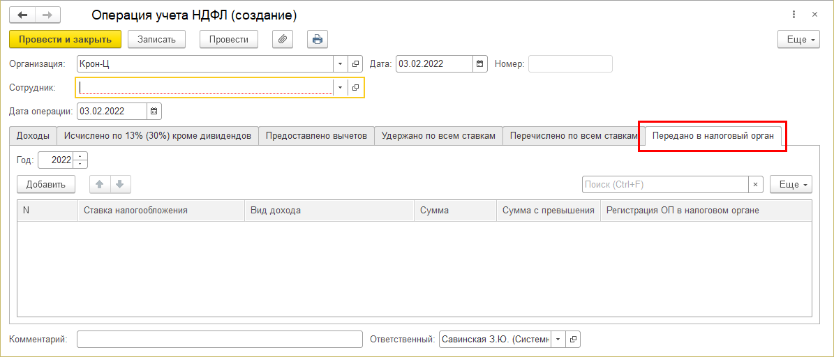 В связи с этим в документе "Операция учета НДФЛ" предоставлена возможность регистрировать суммы неудержанного налога, переданного на взыскание в налоговые органы. Добавлена новая закладка "Передано в налоговый орган".