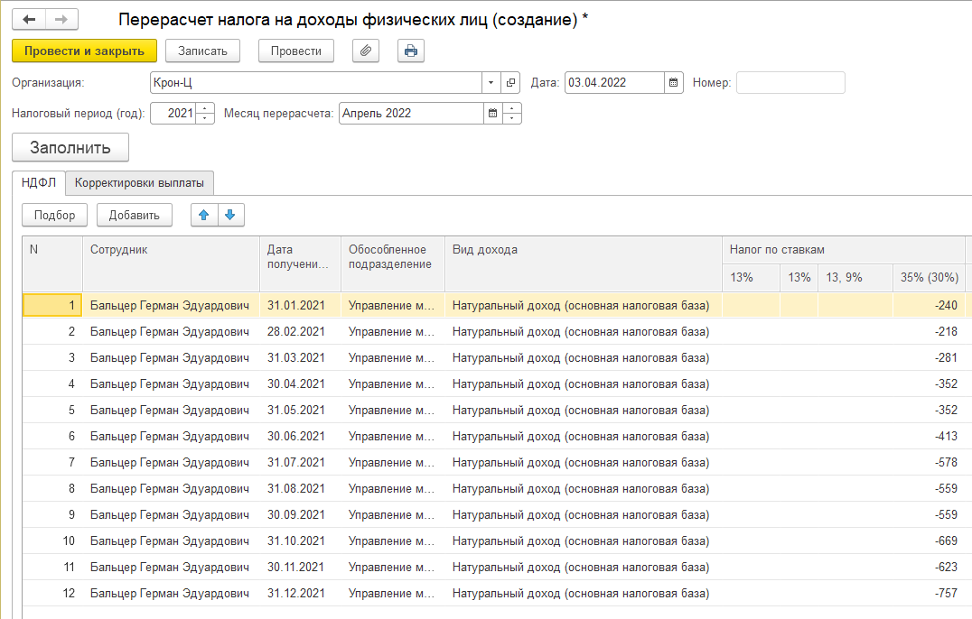 ФНС сообщает, что следует представить уточненный Расчет 6-НДФЛ за 2021 год (п. 6 ст. 81 НК РФ). Зачет излишне удержанного налога в счет платежей 2022 года невозможен, т. е. предусмотрен только возврат налога за 2021 год из ИФНС. В программе перерасчет налога за 2021 можно выполнить документом "Перерасчет НДФЛ", после чего составить корректирующую отчетность.