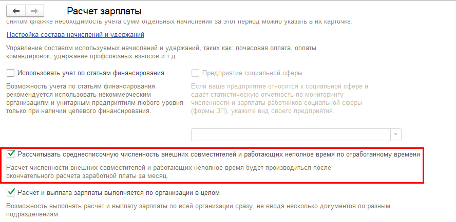 Добавлена новая настройка расчета зарплаты "Рассчитывать среднесписочную численность внешних совместителей и работающих неполное время по отработанном времени". По умолчанию она включена, т.е. действует новый расчет. Если он не подходит, настройку можно отключить.