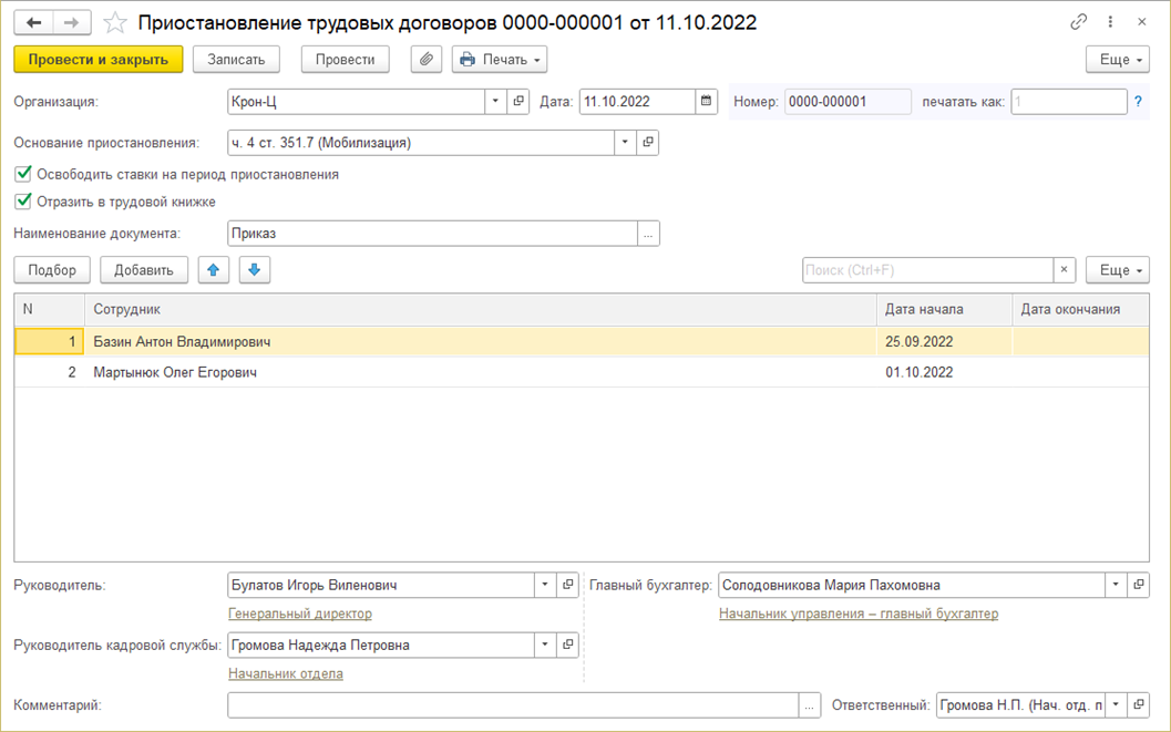 Реализована возможность приостановки трудовых договоров на период мобилизации и других подобных событий.