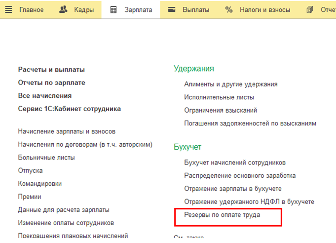 Для расчета резервов следует перейти в раздел "Зарплата – Бухучет – Резервы по оплате труда".