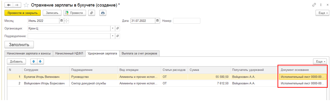 В документе "Отражение зарплаты в бухучете" для удержаний по исполнительным листам добавлен документ-основание, с целью автоматического заполнения платежных поручений на перечисление удержанных из зарплаты сумм в бухгалтерской программе.