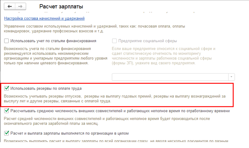Учет резервов – опциональный. Функционал включается в разделе "Настройка – Расчет зарплаты", флаг "Использовать резервы по оплате труда".