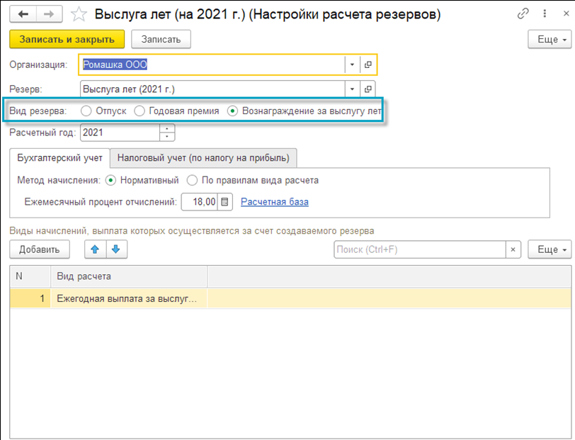 Здесь непосредственно и осуществляется настройка порядка расчета. При создании новой настройки следует указать организацию, резерв и уточнить вид создаваемого резерва (отпуск, годовая премия и т.п.).