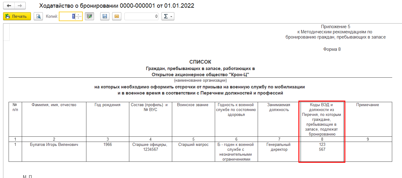 Выполнено обновление форм 2 и 8 воинского учета (печатные формы документа "Ходатайство о бронировании"), в соответствии с постановлением Межведомственной комиссии по вопросам бронирования граждан, пребывающих в запасе от 05.07.2017 № 16.