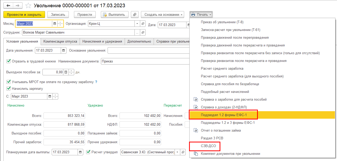 Реализована возможность печати выписки из СЗВ-ДСО и отдельного подраздела 1.2 формы ЕФС-1 из увольнения (например, для печати кадровиком).