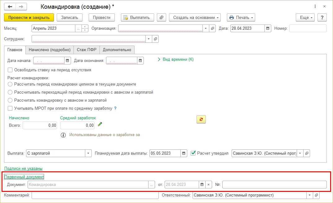 В документы, регистрирующие начисления, добавлена возможность указать реквизиты (наименование, дату, номер) первичного документа (ссылка в самом низу документа).