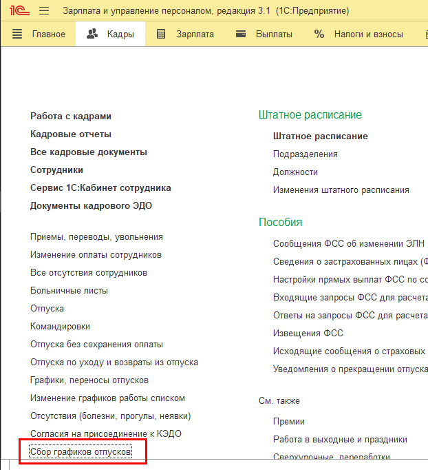 Поддержана возможность планирования (сбора) графика отпусков. Добавлен документ "Сбор графиков отпусков" (раздел Кадры).