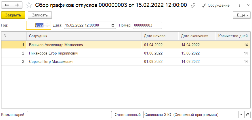 Информация о пожеланиях сотрудников подразделений, поступившая из личных кабинетов, на стороне приложения фиксируется в документе "Сбор графиков отпусков" (по подразделению). Она содержит информацию о годе, на который происходит сбор пожеланий, физических лицах, выбранных ими периодах и количестве дней: