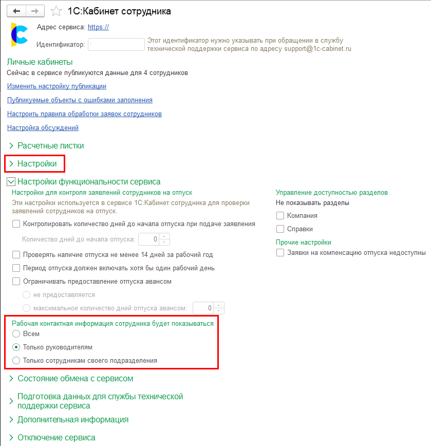 Поддержана возможность настройки доступности рабочей контактной информации сотрудников (доступна начиная с версии сервиса 6.0).