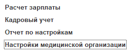 Когда взведен флаг "Работа в медицинском учреждении", в меню "Настройка" появляется отдельный пункт "Настройки медицинской организации":