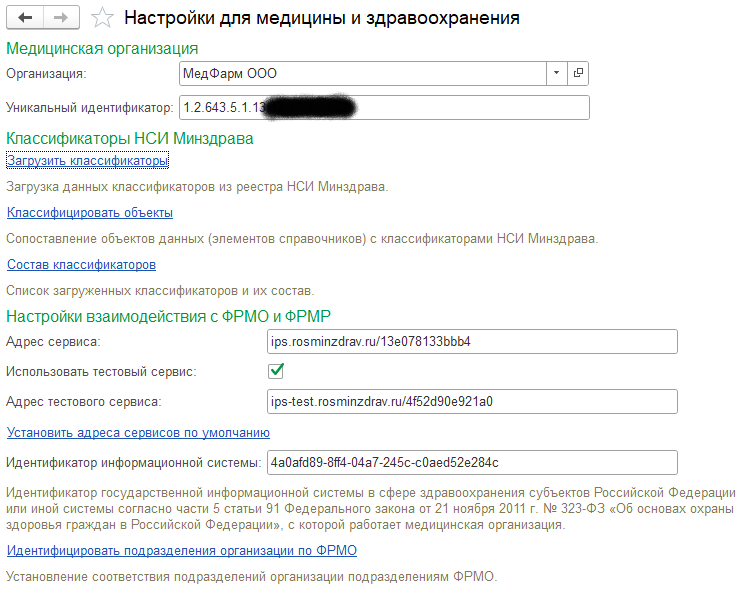 Первое, что необходимо сделать - это указать идентификатор медицинской организации (далее МО) в системе нормативно-справочной информации (далее НСИ) Минздрава.
