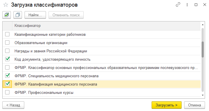 На следующем шаге необходимо выбрать классификаторы к загрузке. НСИ Минздрава очень обширна, поэтому список доступных к загрузке классификаторов предопределен и ограничен ровно теми, что необходимы для дальнейшей работы. По умолчанию все флаги установлены и если их так и оставить, загрузка может занять много времени, так как некоторые классификаторы имеют многие сотни, а иногда и тысячи элементов. Пользователь может снимать и устанавливать флаги, если хочет осуществить загрузку поэтапно, либо ему требуется обновить данные каких-то конкретных классификаторов: