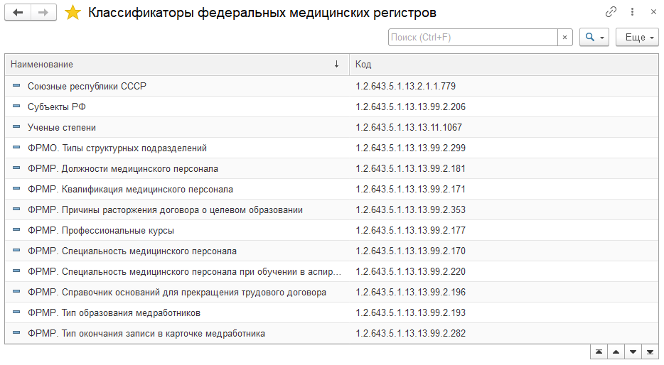 Проверить полученные данные можно перейдя по гиперссылке "Состав классификаторов" в форме настроек. Появится список загруженных классификаторов с указанием их официальных наименований и кодов: