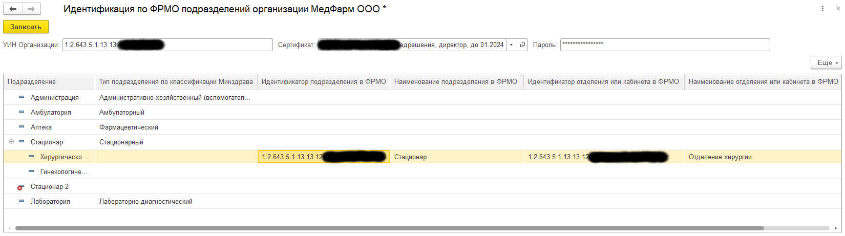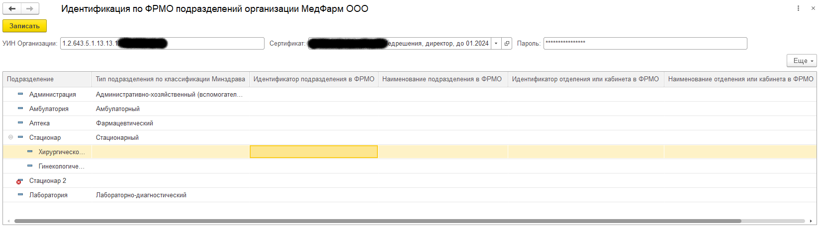 В заголовке формы необходимо указать идентификатор медицинской организации, выбрать сертификат ЭЦП и ввести его пароль. Двойным щелчком в строке подразделения открывается форма выбора подразделения из ФРМО, причём список будет получен из ФРМО только для того типа подразделений, к которому относится подразделение информационной базы (в данном примере - только стационарные подразделения).