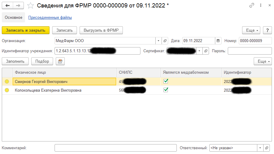 В колонке "Идентификатор" справочно выводится регистровый идентификатор медработника, если он известен. При первой отправке данных, когда идентификатор ФРМР ещё не известен, делается попытка определить его по СНИЛС физического лица с помощью отдельного запроса к ФРМР. Если по СНИЛС идентификатор определить не удаётся, выполняется попытка добавления медработника в регистр.