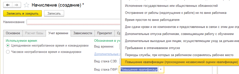 Для использования КВАЛИФОЦ необходимо создать начисление с новым видом стажа ПФР "Повышение квалификации (прохождение независимой оценки квалификации)" и указать его в документе "Отсутствие с сохранением оплаты". Для этого кода не заполняются территориальные условия, код особых условий труда и код основания для досрочного назначения пенсии.