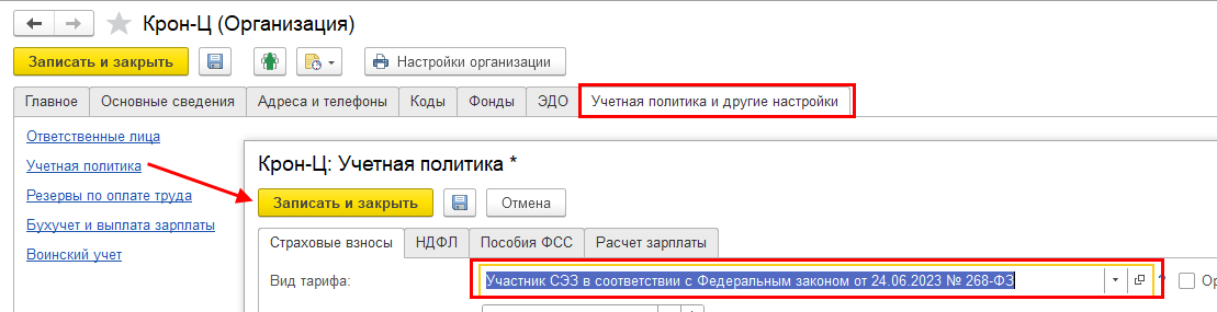 Добавлен новый тариф страховых взносов "Участник СЭЗ в соответствии с Федеральным законом от 24.06.2023 № 268-ФЗ".