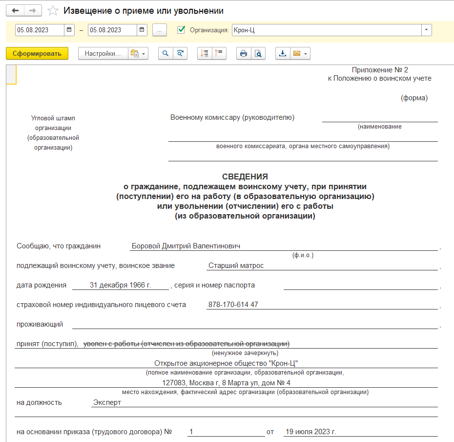 Форма воинского учета "Извещение о приеме или увольнении" приведена в соответствие с Постановлением Правительства РФ от 25.07.2023 № 1211.