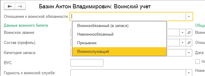 Для облегчения выбора значение "Военнообязанный" переименовано в "Военнообязанный (в запасе)".