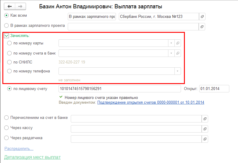 В случае его выбора, при указании такого зарплатного проекта в разделе "Выплата зарплаты" карточки сотрудника появляется возможность вместо номера лицевого счета указать или номер карты, или СНИЛС, или номер телефона, или номер счета в другом банке.