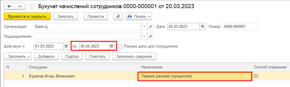В документ "Бухучет начислений сотрудников" добавлена возможность указать дату окончания, а также снято ограничение на выбор только плановых начислений.