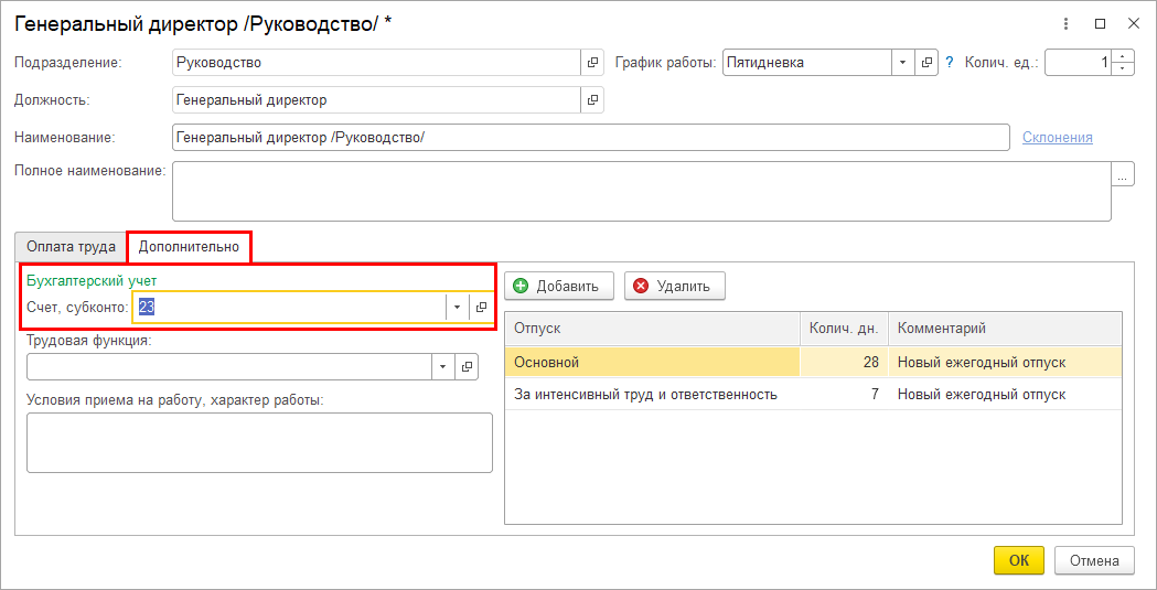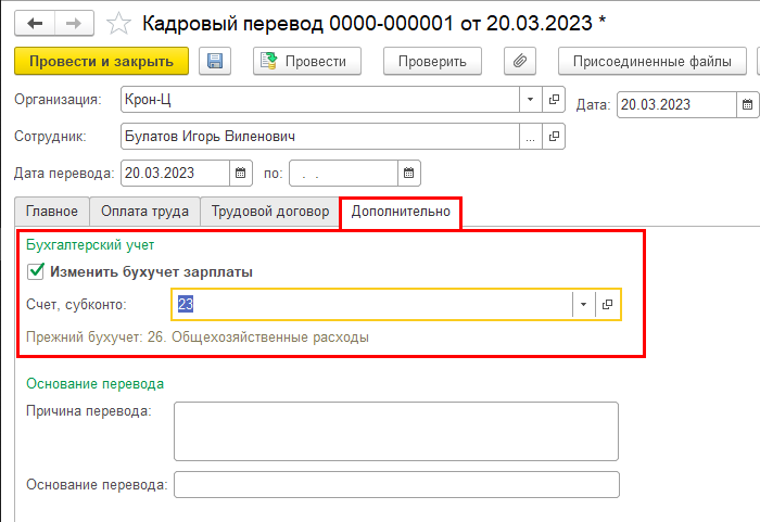 Добавлена возможность указывать бухучет зарплаты в кадровых документах и в позициях штатного расписания (для подстановки в кадровые документы). В кадровых переводах регистрация бухучета доступна только если взведен флаг "Изменить бухучет", который доступен только при установке флага изменения рабочего места. Можно указать бухучет в кадровых документах введенных одной датой, например прием на работу и в этот же день кадровый перевод.
