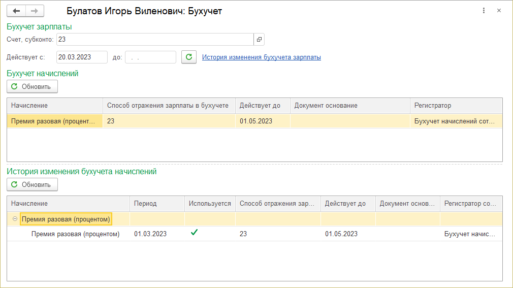 В разделе "Настройки бухучета" карточки сотрудника теперь показывается не только настройка бухучета основного заработка, но и бухучет начислений сотрудника и его история.