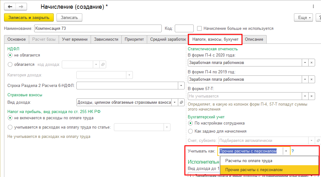 Для начислений, которые могут отражаться в бухучете как прочие расчеты с персоналом со способом начисления "По отдельному документу", теперь способ расчетов можно указать непосредственно в начислении.