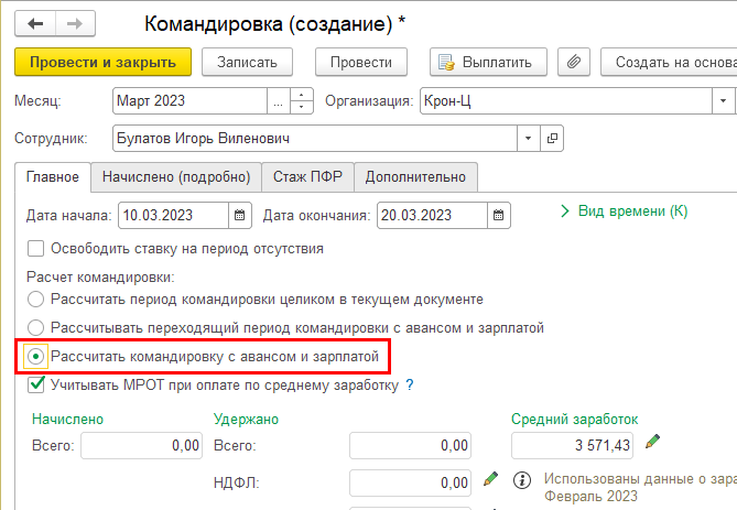 Добавлен новый способ оплаты (расчета) командировки "Рассчитать командировку с авансом и зарплатой": теперь командировку даже полностью текущего месяца можно рассчитывать не в самом документе командировки, а в документах начисления зарплаты и за первую половину месяца. Изменены названия имеющихся ранее двух способов, без изменения их функциональности.