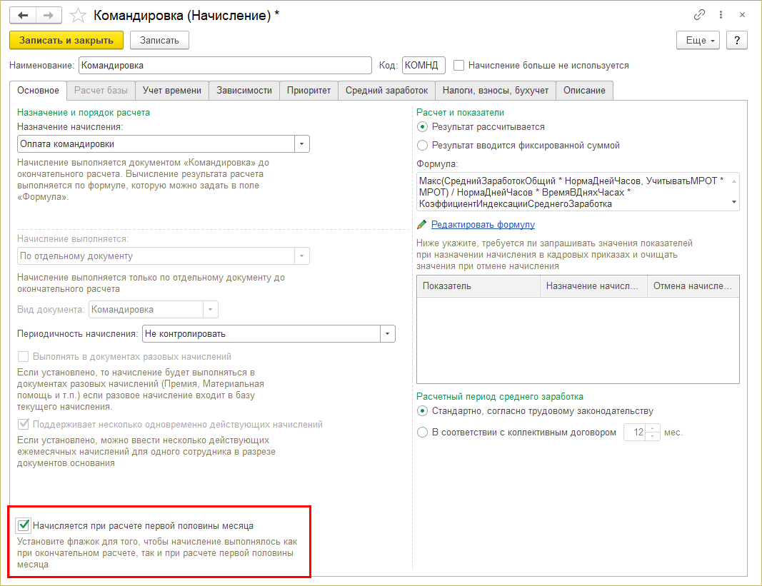 Также для начисления командировки в начислении за первую половину месяца в ее карточке необходимо установить соответствующий флажок.