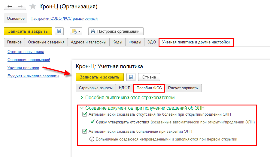 В учетную политику организации по пособиям ФСС добавлены настройки автоматического создания отсутствий и больничных.