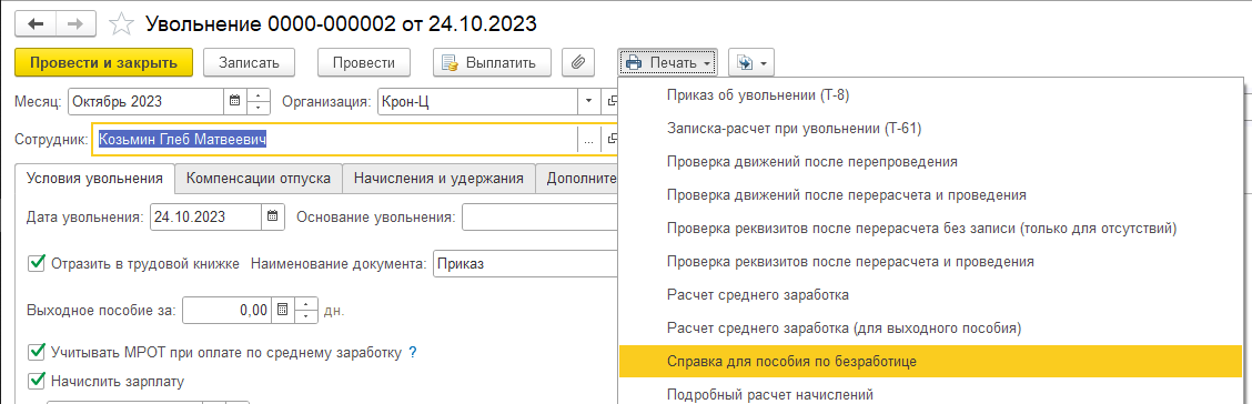 Реализовано заполнение справки о среднем заработке для пособия по безработице в соответствии с Постановлением Правительства РФ от 24.06.2023 № 1026.