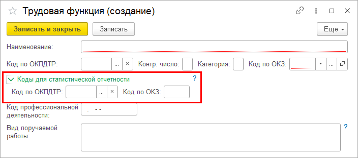 В карточке трудовой функции добавлена возможность указания отдельных кодов ОКПДТР и ОКЗ для форм статистики 57-Т и 1-Т(проф), с выбором из классификатора Росстата (несколько отличается от классификатора Госстандарта).