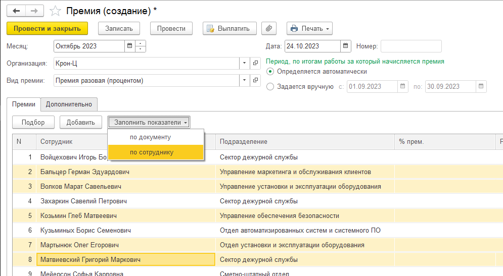 Команда "Заполнить показатели" преобразована в подменю. Пункт "по сотруднику" заполняет показатели по сотрудникам из выделенных строк в табличной части. Если по одному сотруднику есть несколько строк, а выделена одна строка, то показатели заполнятся по всем строкам этого сотрудника. Пункт "по документу" – заполняет по всей табличной части (как и было ранее по команде "Заполнить показатели").