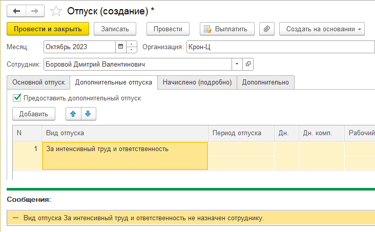 Теперь выдается предупреждение при предоставлении ежегодного дополнительного отпуска сотруднику, на который у него нет прав.