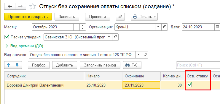 Добавлена возможность освобождения ставки в документе "Отпуск без сохранения оплаты списком".