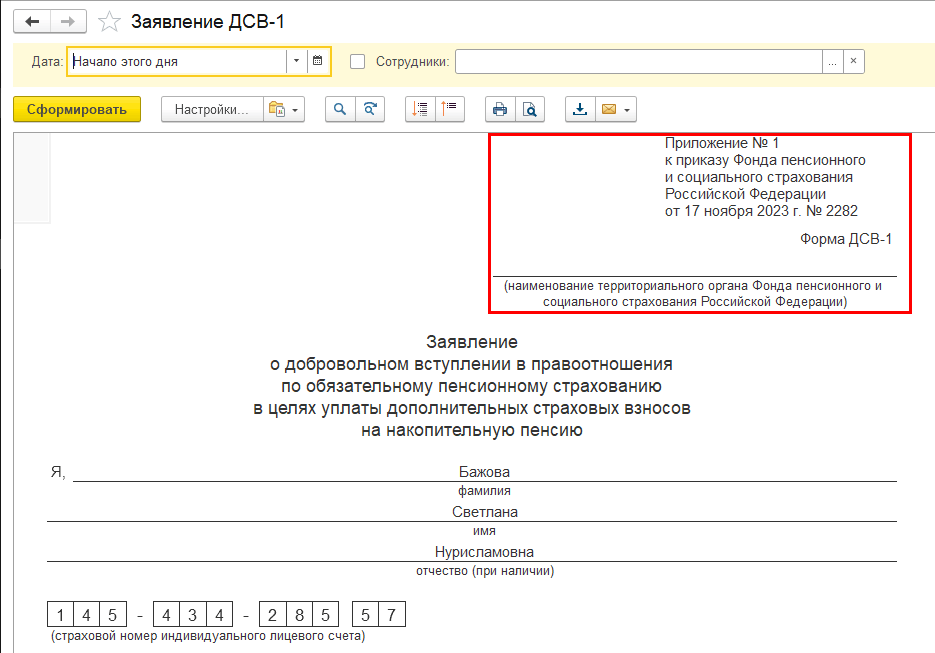 Выполнено обновление формы заявления ДСВ-1 в соответствии с Приказом СФР от 17.11.2023 N 2282.