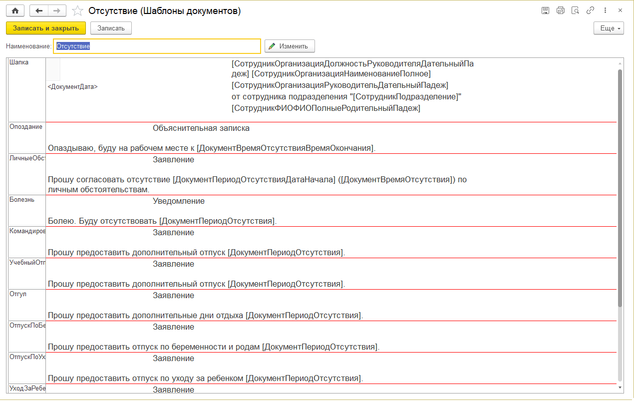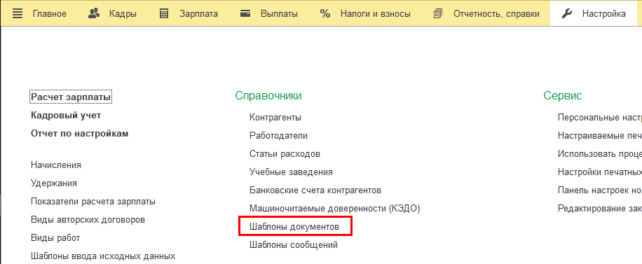 В справочнике "Шаблоны документов", помимо наименования шаблона, задаются его настройки. Предопределенные элементы соответствуют предопределенным документам в 1С:Кабинет сотрудника.