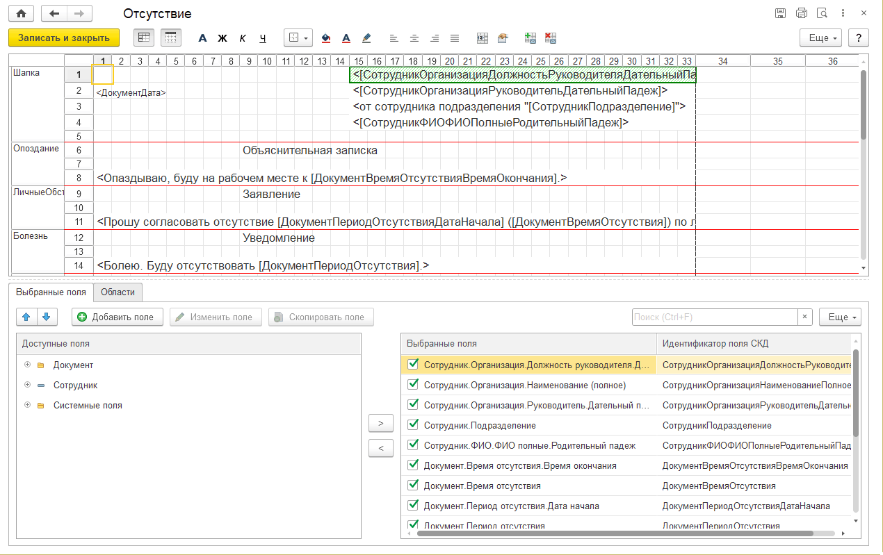 В редакторе шаблона используется специально подготовленный отчет. Он содержит наборы данных, которые возможно проанализировать или показать на стороне 1С:Кабинет сотрудника: Организация, Подразделение, Должность и т.д. Для предопределенных видов наборы расширяются специфичными для них данными.