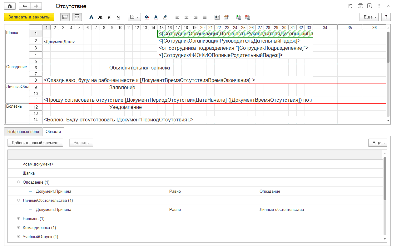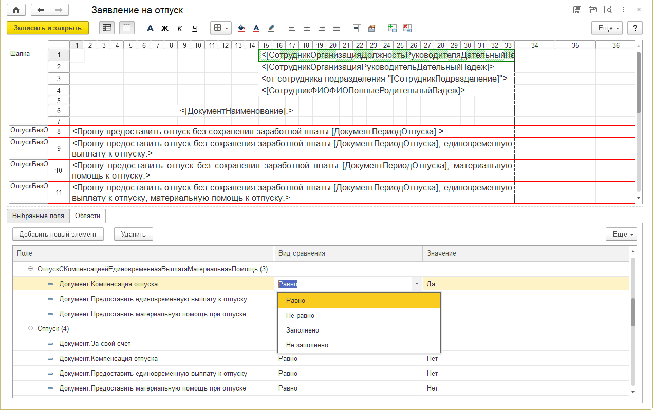 Шаблон представляет из себя макет табличного документа, который разбивается на области. Области выводятся в порядке размещения в макете. Каждая область может иметь список условий формирования. Корневые условия областей объединяются по «И». Нет ограничений на оформление условий средствами системы компоновки данных (СКД). Возможны все доступные виды сравнений, а так же добавление групп условий по «И» или по «Или».