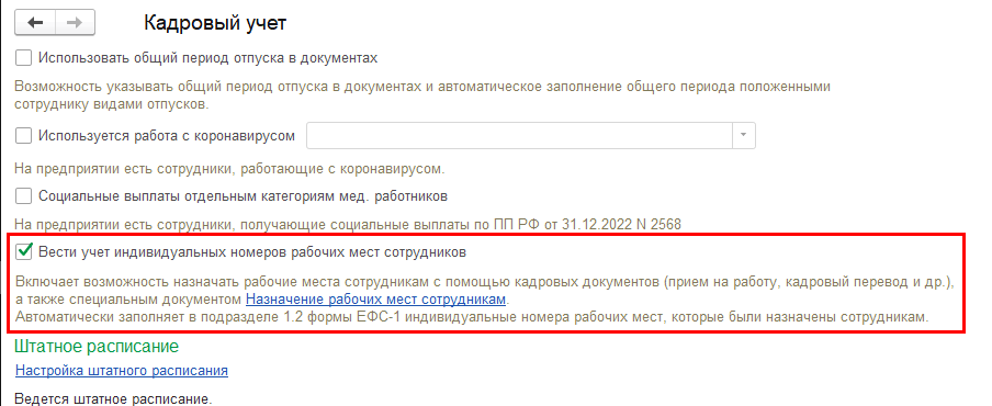 Она включается в разделе Настройка – Кадровый учет – Вести учет индивидуальных номеров рабочих мест сотрудников.