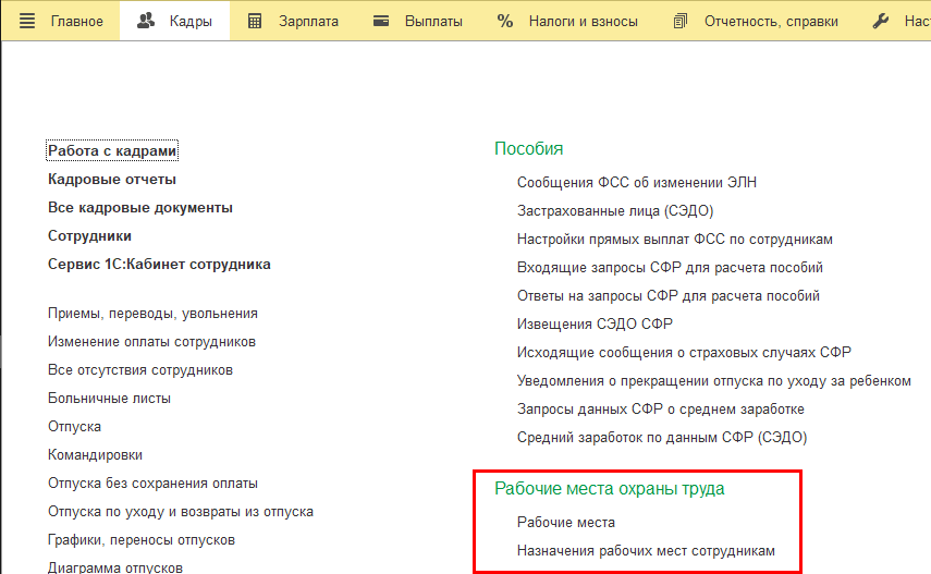 После этого в разделе "Кадры" появится новый подраздел "Рабочие места охраны труда".