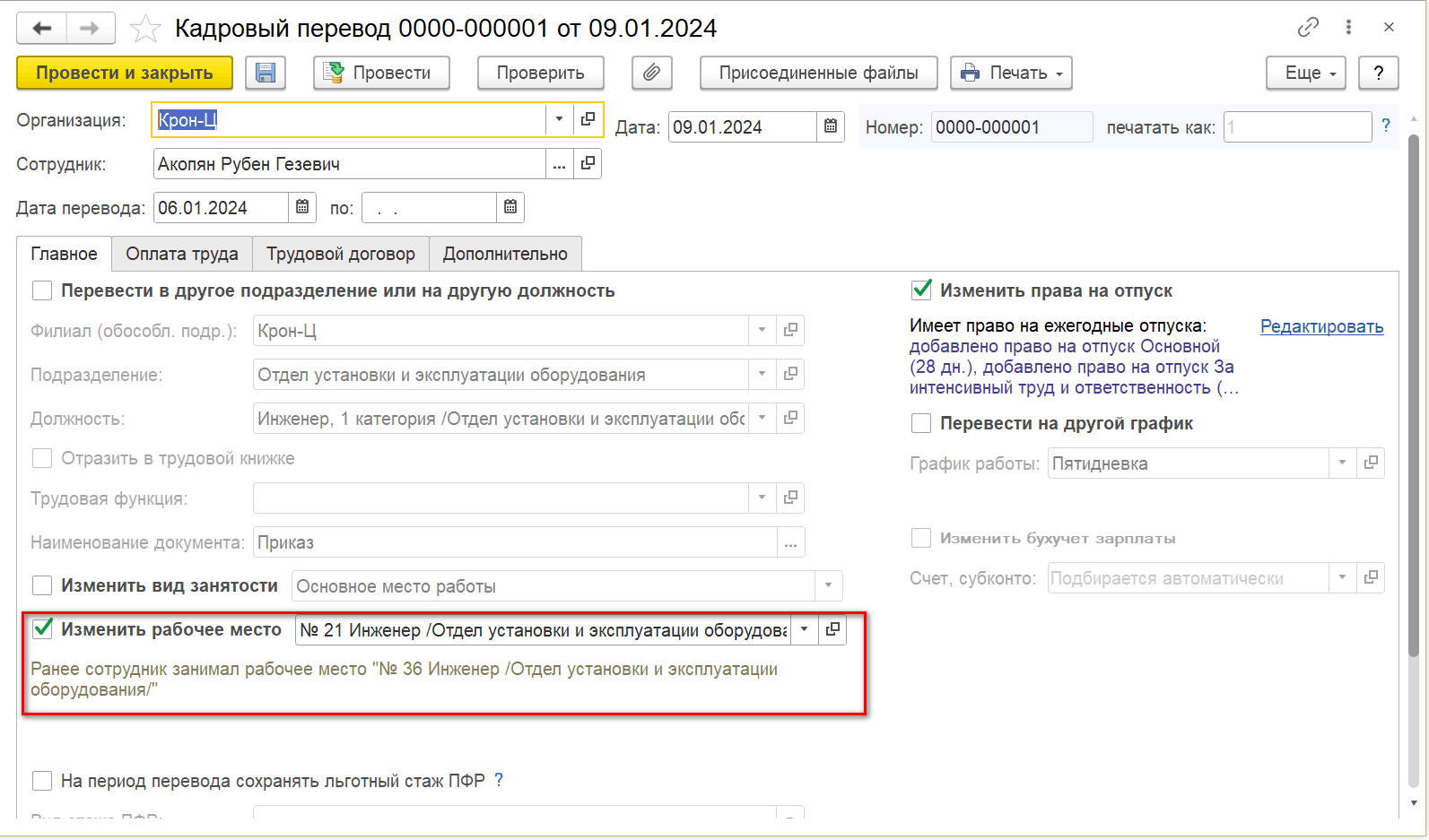 Появляется возможность ввести номера в кадровых документах, а также отдельным новым документом "Назначение рабочих мест сотрудникам".