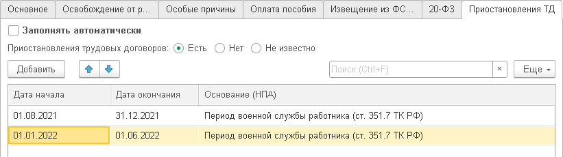 И добавлена закладка "Приостановления ТД", на которой размещен список приостановлений трудовых договоров, а также соответствующие настройки заполнения. Когда приостановлений нет, таблица не отображается.