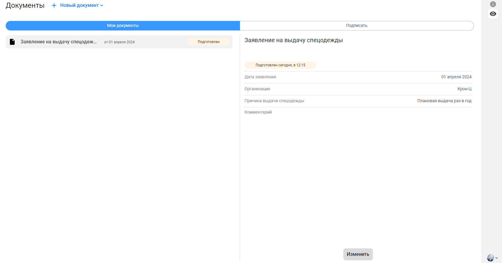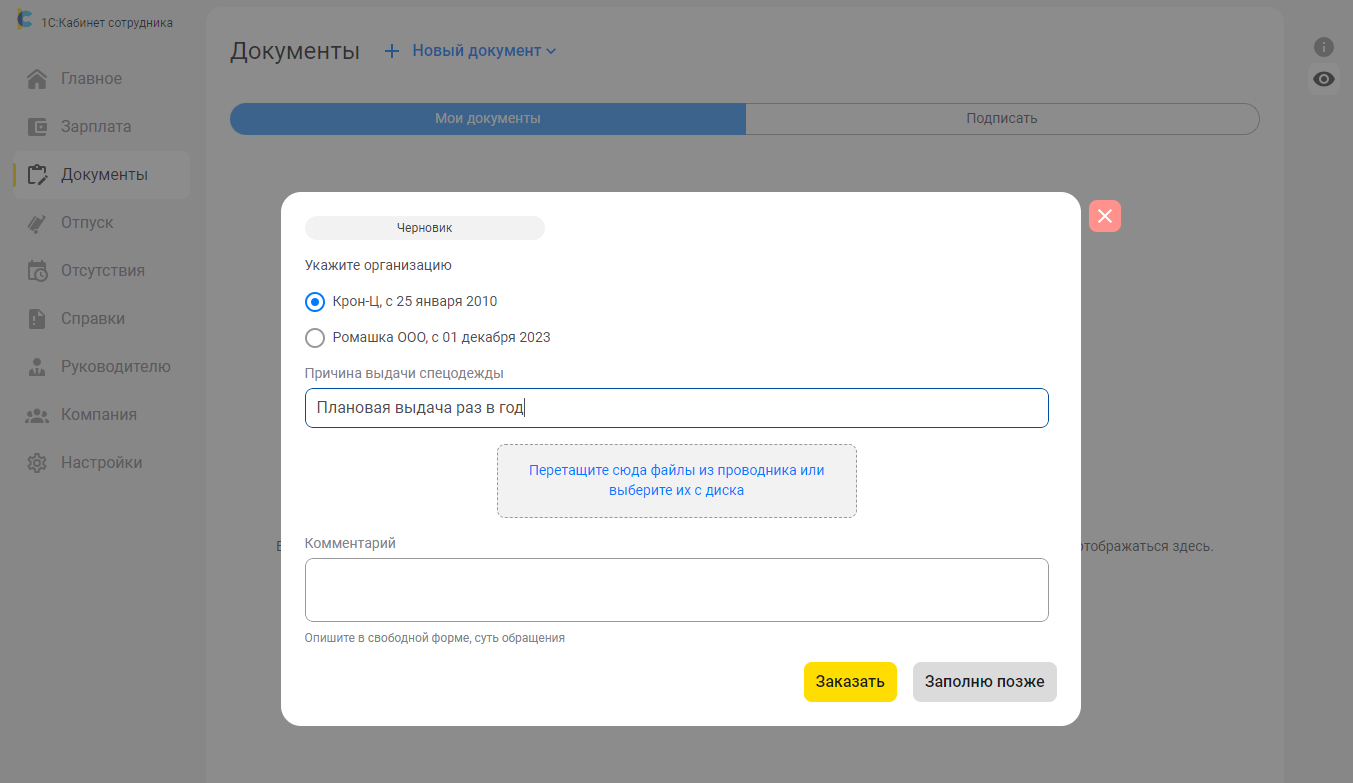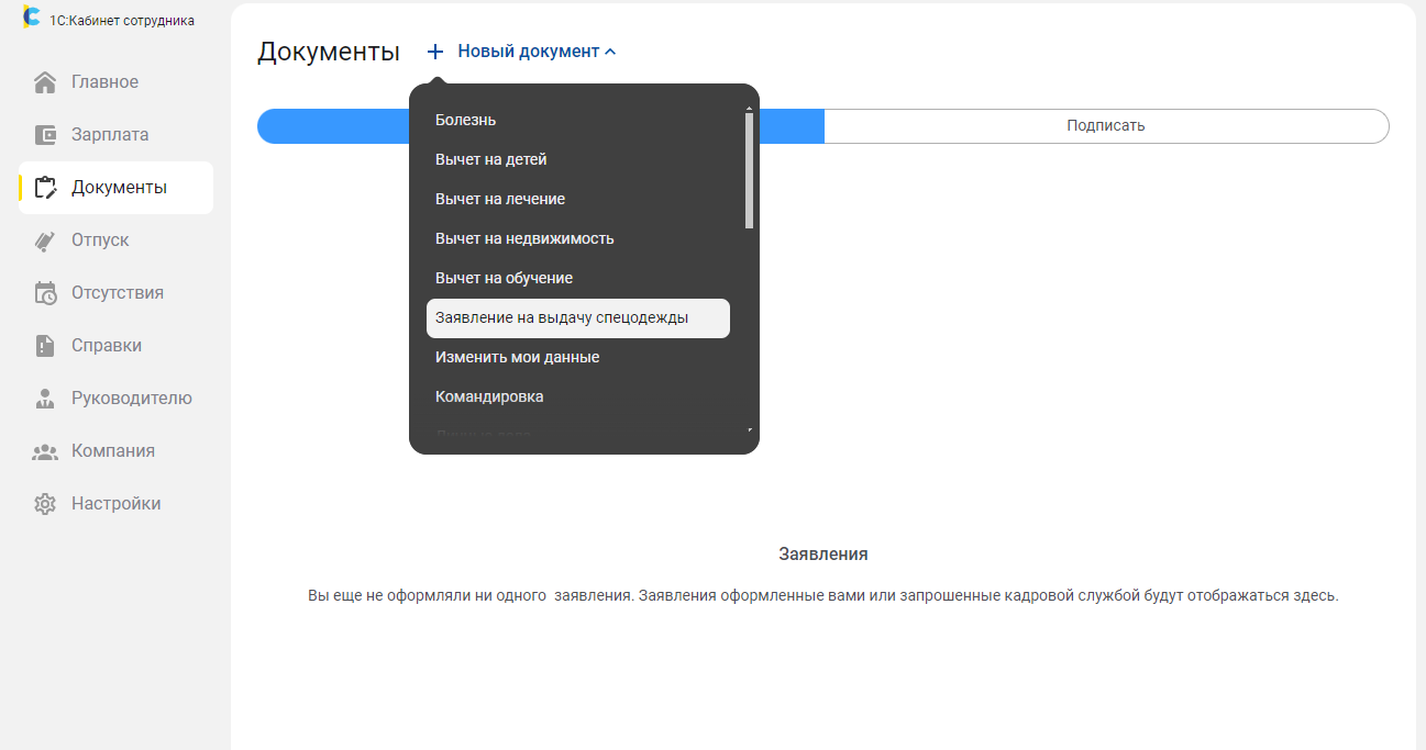 После подготовки шаблона на стороне "1Сабинет сотрудника" сотрудник добавляет новый документ.