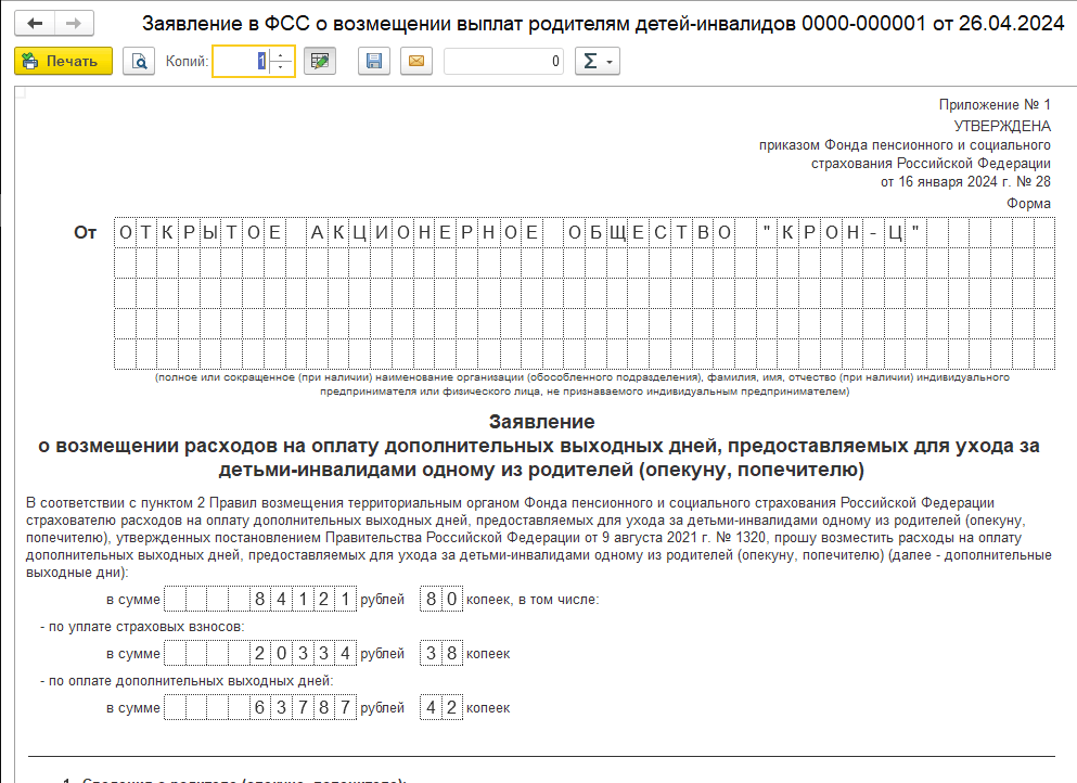 Реализована новая форма заявления о возмещении выплат родителям детей-инвалидов, в соответствии с Приказом СФР от 16.01.2024 № 28.