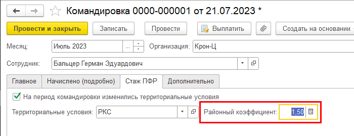 Добавлена возможность указания районного коэффициента в командировке при смене территориальных условий для его заполнения в ЕФС-1.